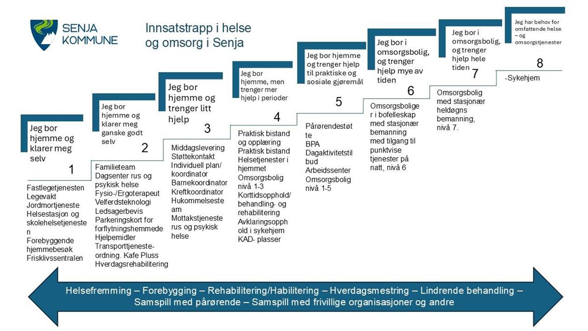 Innsatstrappa i helse og omsorgInnsatstrappa i Senja kommune viser hvilke tjenester vi har hvor, i forhold til våre eldre innbyggere. Sist endret 17.10.2025 13.43 Helse- og omsorgsplan 2024-2040, ble vedtatt i kommunestyret 20. juni 2024 (PDF, 4 MB), og ligger til grunn for tjenestene innen helse- og omsorgssektoren i Senja kommune.Innsatstrappa i helse og omsorgTrappemodellen viser kommunens tilbud gradert etter hvor mye de ulike tjenestene påvirker mottakernes liv.De laveste trinnene er forebyggende tiltak, mens de høyeste er institusjonsbasert omsorg. Hensikten er å dreie ressursene mot egenmestring og forebygging, for å redusere kostbare inngripende tiltak.I perioden 2025-2030, jobber Senja kommune med omstilling Nyttige lenkerInnsatstrappa i helse og omsorg i Senja kommune (JPG, 197 kB)Hva er våre omsorgstjenesterHva er våre helsetjenester