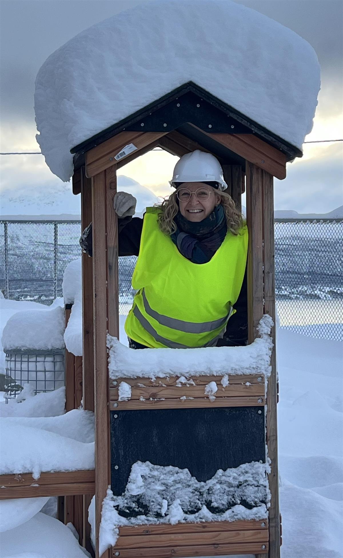 Kommunalsjef Hege Vigstad er også godt fornøyd med lekeapparatene til ny Dansesletta barnehage. Alle foto: Kari H. Slaattelid, Senja kommune.– Nå er vi i innspurten med det siste som skal ferdigstilles på bygget, og overlevering skjer i løpet av de nærmeste ukene, forteller Hege Vigstad, kommunalsjef Samfunnsutvikling i Senja kommune.