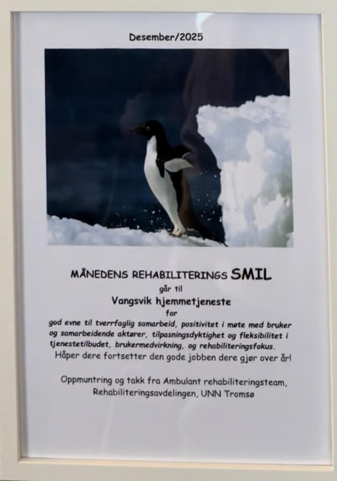 – Vi er en liten rehabiliteringsavdeling og er svært stolte og takknemlige over å ha mottatt en slik fin oppmuntring fra det ambulante rehabiliteringsteamet på UNN, forteller Nora Adolfsen, helsefagarbeider i Hjemmesykepleien i Vangsvik.