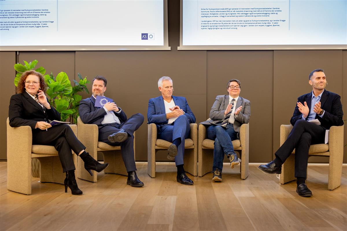 Få flere flyktninger i jobbSpråkkrav må tilpasses oppgavene og rekrutteringsprogrammet til helsejobber må bygge videre på det som virker. Dette kom fram under en panelsamtale nylig, om hvordan stat og kommune kan få flere flyktninger i jobb. Sist endret 02.12.2025 13.56 Fv. Marit Roxrud Leinardt, direktør arbeidsgiverpolitikk, KS, Geir Aga, administrerende direktør, KS, Kjetil Vevle, statssekretær, Arbeids- og inkluderingsdepartementet, Stine Jakobsson Strømsø, kommunedirektør, Senja kommune og Børge Toft, kommunedirektør, Arendal kommune. Thomas Winje Øijord, KS Statssekretær Kjetil Vevle fra Arbeids- og inkluderingsdepartementet, kommunedirektørene Børge Toft fra Arendal kommune og Stine Jakobsson Strømsø fra Senja kommune og administrerende direktør i KS, Geir B. Føyner Aga, deltok i panelsamtalen.De diskuterte blant annet om hvordan flere flyktninger kan inkluderes i arbeidslivet, og de la spesielt vekt på utfordringer og muligheter for flyktninger innen helse- og omsorgstjenestene.Kommunene trenger handlingsrom– Hvis vi skal lykkes med å rekruttere flere fra utenforskap til helse- og omsorgstjenestene, må vi bygge videre på det som allerede fungerer og unngå for mange statlige føringer, sier administrerende direktør Geir B. Føyner Aga i KS.For å lykkes med å få flere flyktninger i jobb, må kommunene ha frihet til å forme tiltakene slik at de best mulig møter lokale behov.Språkkrav må tilpasses oppgavene og rekrutteringsprogrammet til helsejobber må bygge videre på det som virker. Les mer om saken: Kommunene trenger handlingsrom for å få flere flyktninger i arbeid.Fra panelsamtale om hvordan stat og kommune kan få flere flyktninger i jobb. Thomas Winje Øijord, KS