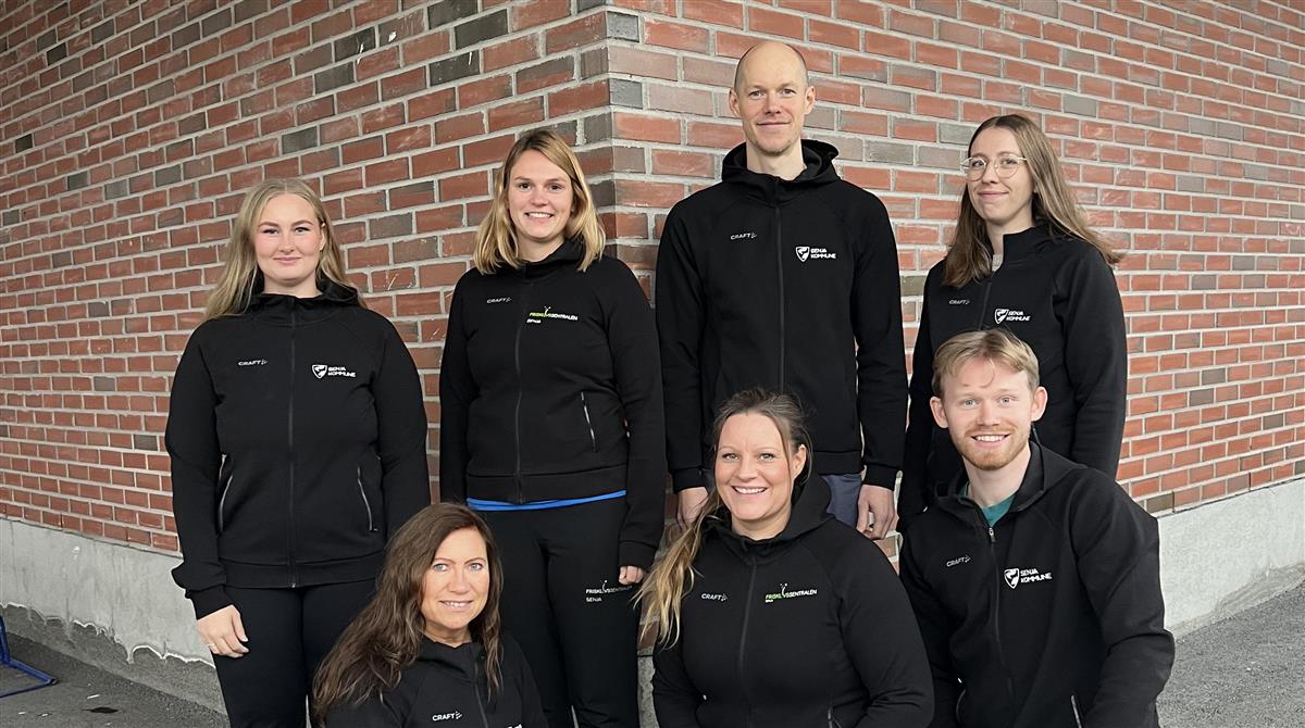 Bakerst fv. fysioterapeut Kamilla Ronessen, frisklivsveileder Line Tønnessen, avd. leder og fysioterapeut Alexander Gotfredsen og ergoterapeut Anja Karolius. Fremst fv. ergoterapeut Ann-Mari Røymstad, frisklivsveileder Lise Schulstad og turnusfysioterapeut Vebjørn Martinsen.
