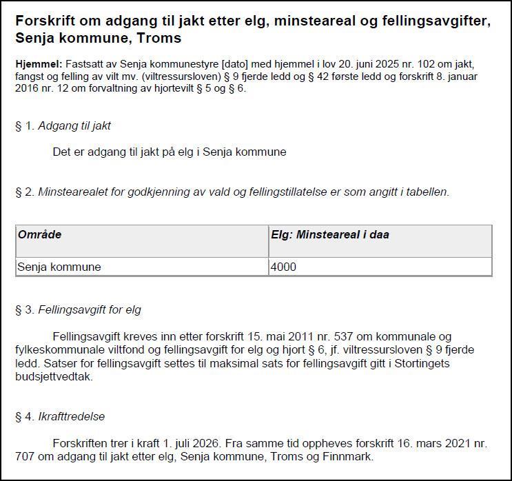 For å oppfylle kravene i viltressursloven må Senja kommune revidere gjeldende forskrift slik at den også omfatter regulering av fellingsavgift. En ny paragraf foreslås tilføyd, som både henviser til nasjonal forskrift og fastsetter at kommunen benytter maksimal sats gitt i Stortingets budsjettvedtak.
