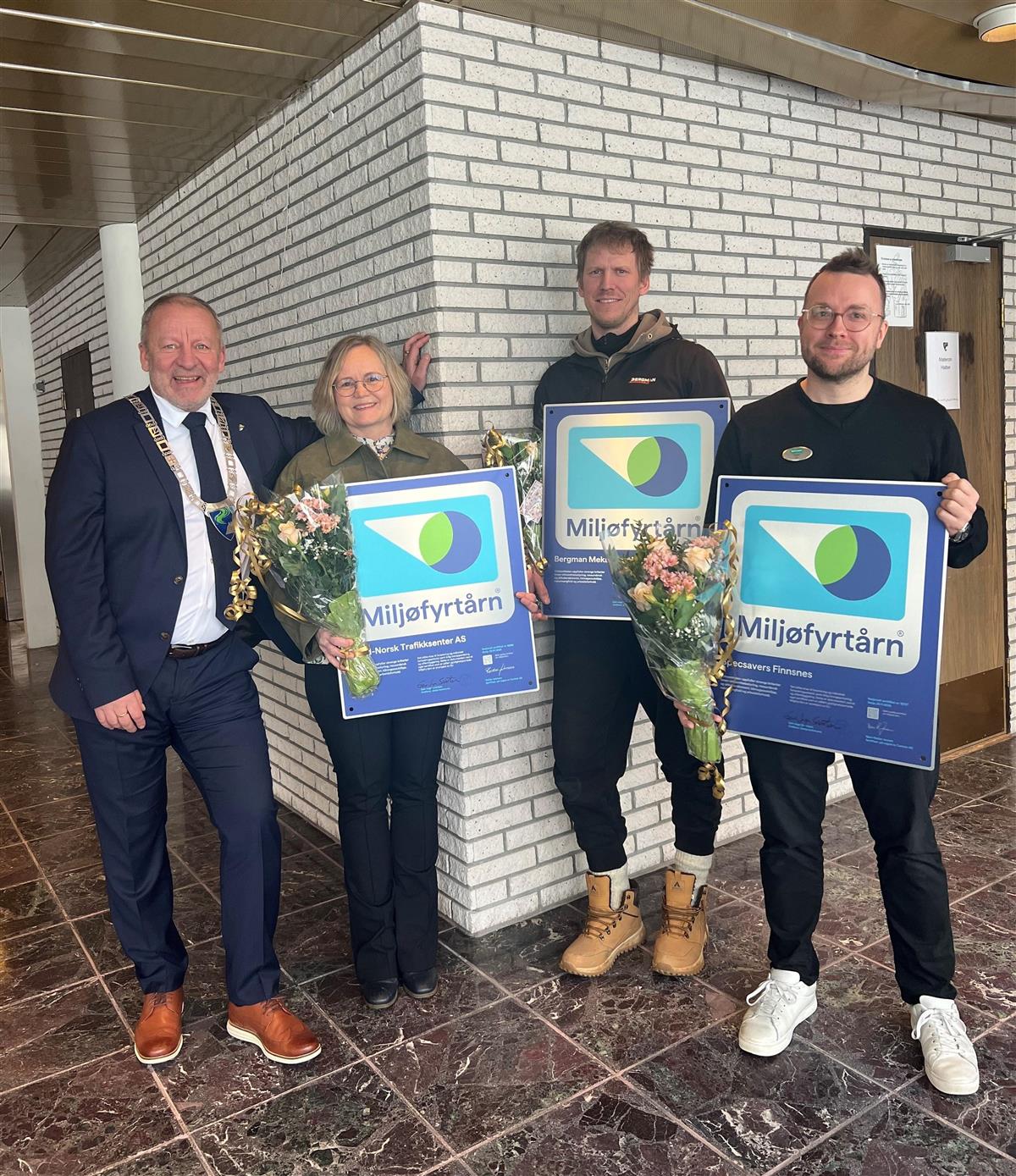 Fv. ordfører i Senja kommune, Geir-Inge Sivertsen, Nordnorsk trafikksenter v/Hege Pedersen, Bergmann mekaniske v/Øystein Johnsen og Specsavers Finnsnes v/Kjetil Bjørkeng. Sport 1 v/Anne Aarnseth, butikksjef er ikke med på bildet, men fått utdelt sertifiseringsbeviset.