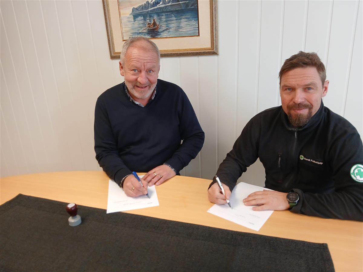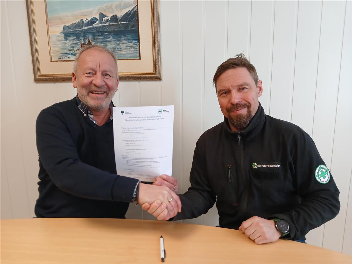 Beredskapsavtalen. Fv. Geir-Inge Sivertsen, ordfører i Senja kommune og Mats Kongshaug, leder i Norsk folkehjelp Midt-Troms.I tillegg vi vi bistå med støtte til kommunen knyttet til søk og redning, evakuering og bemanning og evakuerings- og pårørendesenter, og rapportere til kommunen etter gjennomførte oppdrag.