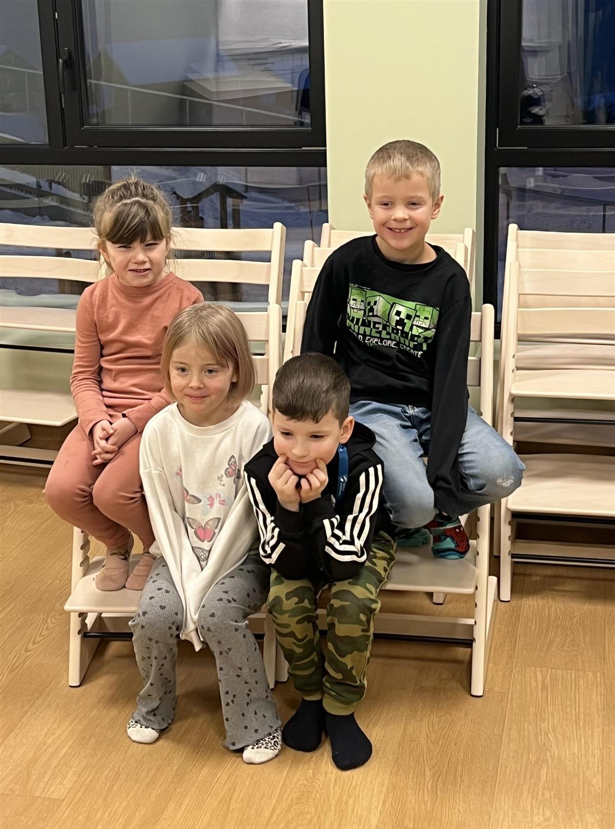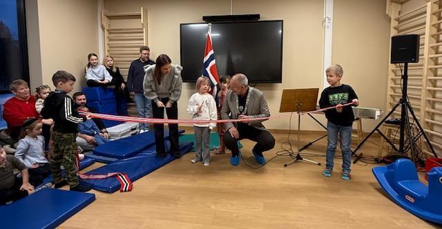5-åringene Eirin Lovise Dahl og Einar Nymo, og fremst Signa Oliva Sellevoll og Tormod Nore Log, som mener den nye barnehagen i Vangsvik er tipp topp, tommel opp!Prosjektet med å bygge den nye barnehagen startet høsten 2024 og ble overlevert til Senja kommune 9. desember 2025.