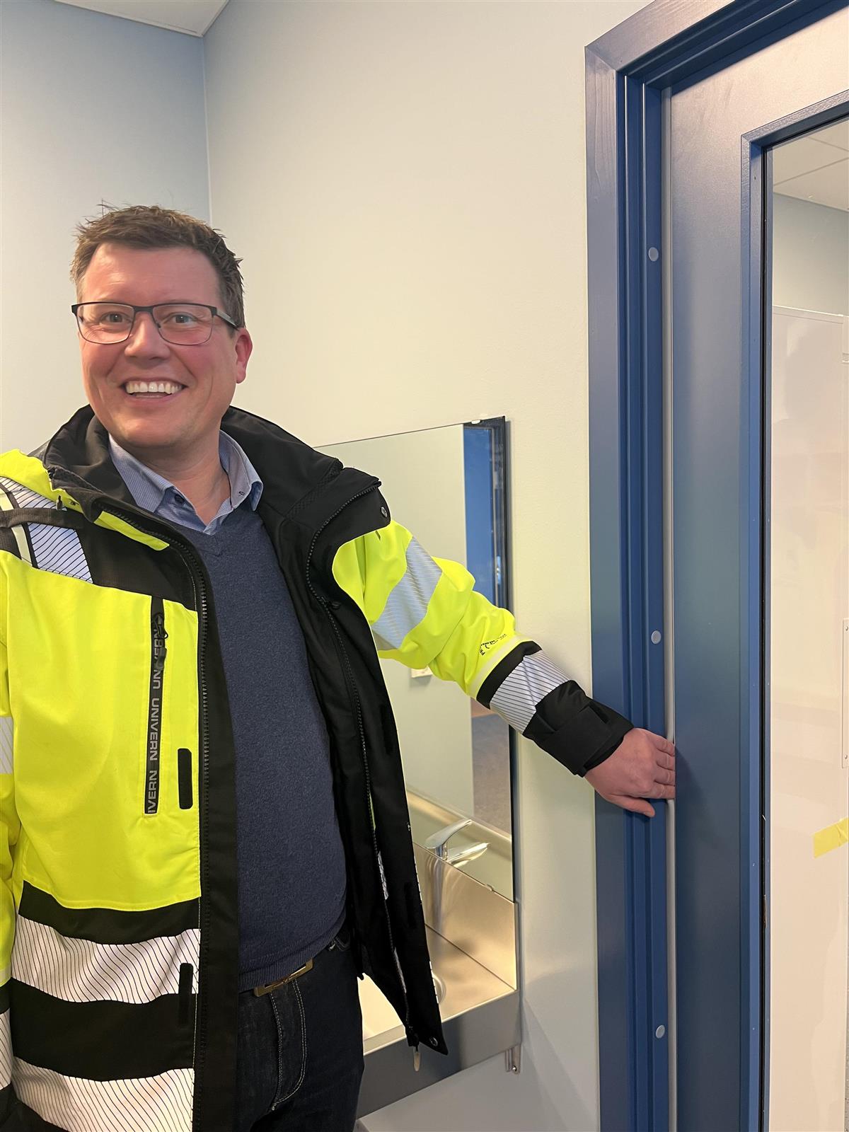 Eirik Hamsund tester klemsikre dører.– Vi har leid inn byggeleder fra HRP as i prosjektet. Det er et samarbeid vi er svært fornøyde med, og som er medvirkende til at vi leverer både på tid, økonomi og HMS, poengterer Eirik Hamsund, prosjektleder- og koordinator i Senja kommune.